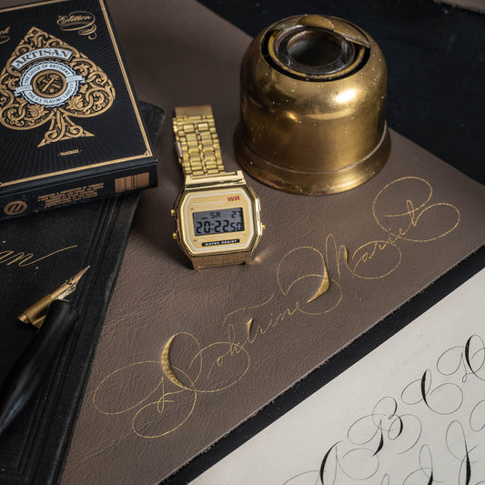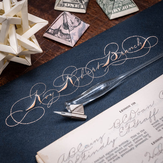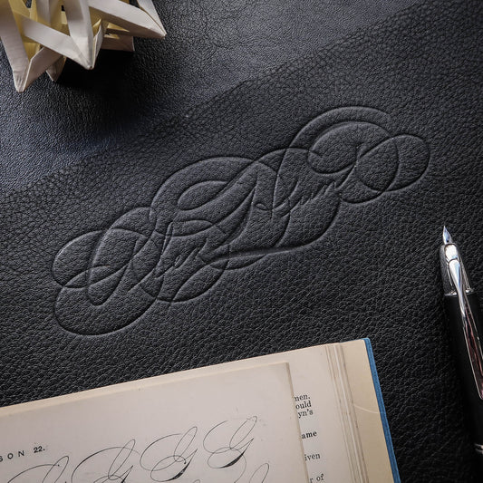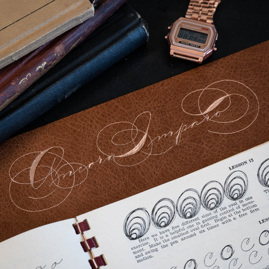 "This leather is perfect! Durable, pliable, and just the right cushion for my work. No more wasting paper or cluttering work space with news paper lol. Just roll it out and go to work. The hand written Spencerian letter is beautiful. I have it hanging on my wall for everyday reference and inspiration."